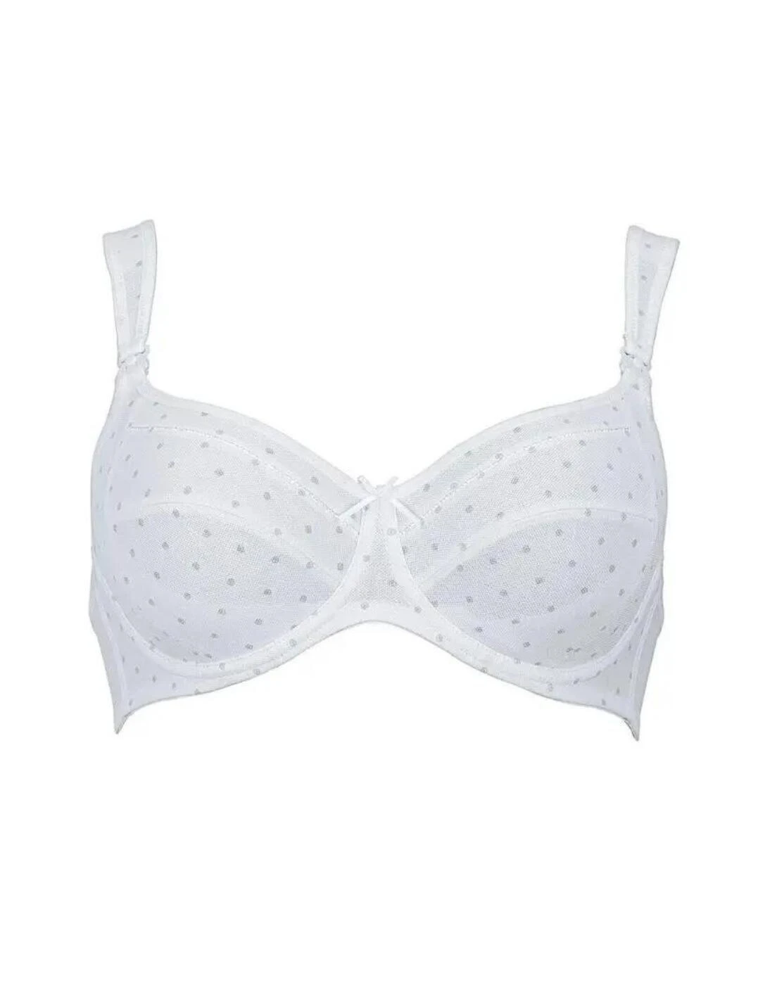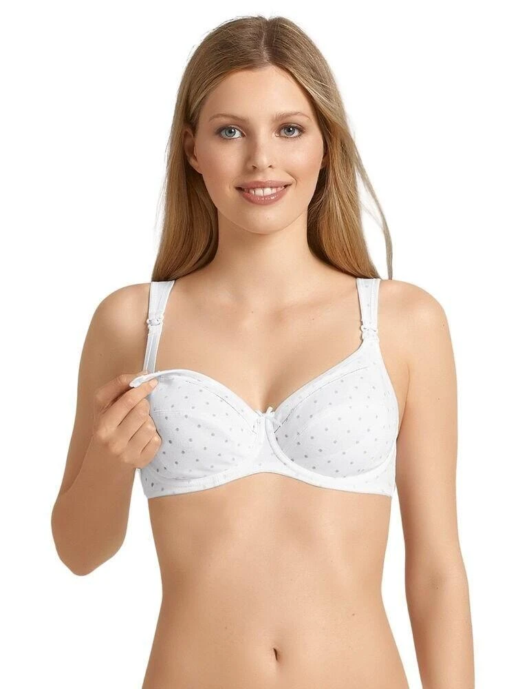 Feel comfortable and supported during breastfeeding months in this underwired nursing bra from the Miss Cotton range by Anita Maternity. This bra features a pretty, subtle polka dot print which is further complimented by a dainty bow for a pretty look. This bra is underwired for support and uplift and equally non-padded for a natural fit and feel. This bra has discreet nursing clips which open the cup and make breastfeeding a breeze. The comfort straps are wide for comfort and support and are also adjustable, allowing you to find an individual fit. This bra secures at the rear with a hook and eye closure. Make sure to add this essential to your maternity lingerie collection.