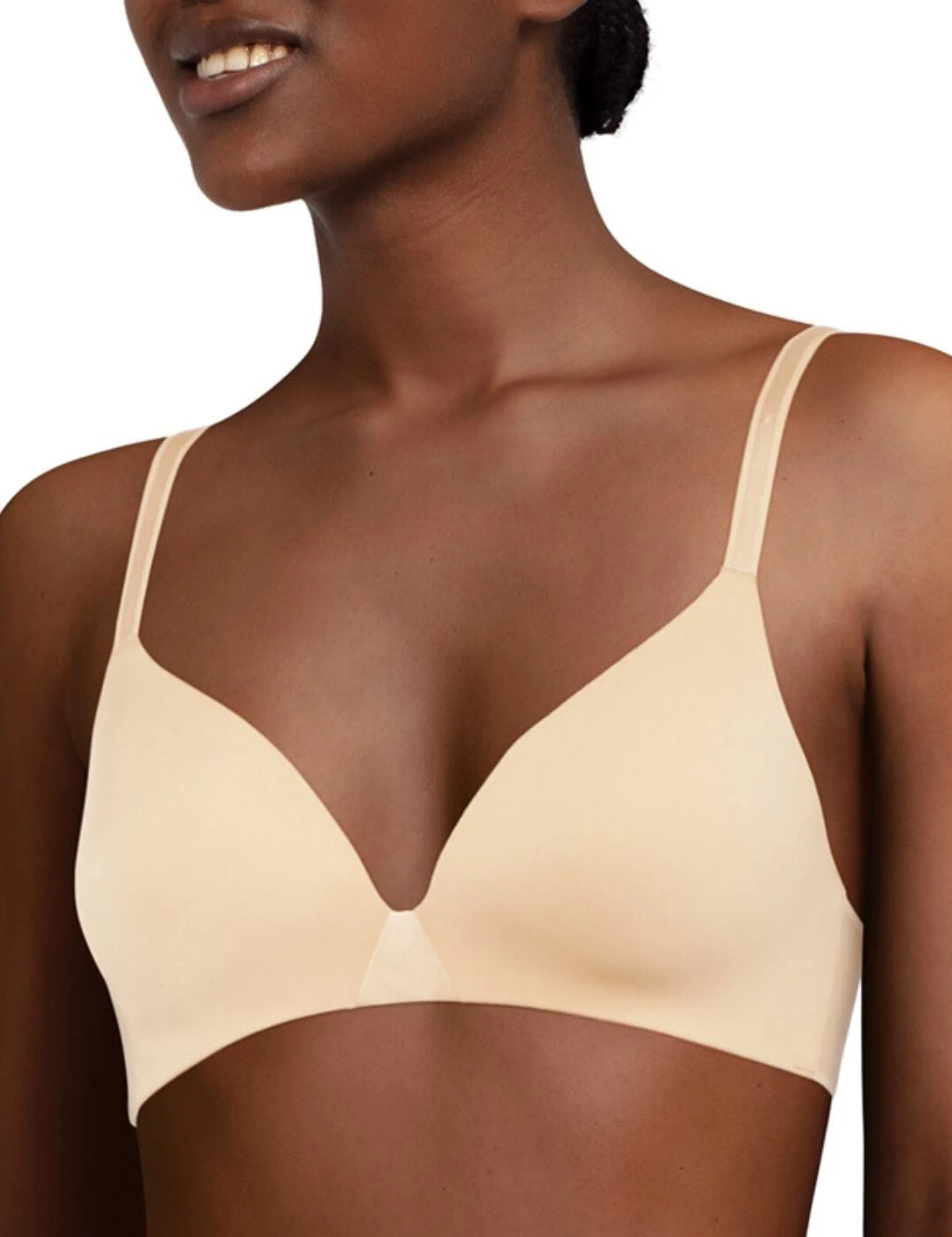 Add a touch of classic luxury to your everyday lingerie collection with this superbly designed non-wired t-shirt bra from Chantelle’s Essentiall collection! Ultra comfortable, wirefree triangle cups in a smooth, soft knit, sit on a base, ensuring you feel adequately supported as you go about your day. The soft and semi-rigid cup pads give extra reassurance. The seamless finishes and the gorgeous smooth materials give a comfortable, second-skin feeling, making this bra invisible under even the most form fitting clothing! The lined chimney back, fully adjustable straps, and 4-rank padded hook and eye closure offer further support and an individualised fit, perfect for all body types. Features the Chantelle logo embossed on the side. Pair with coordinating briefs from the Essentiall range to complete this classic look!