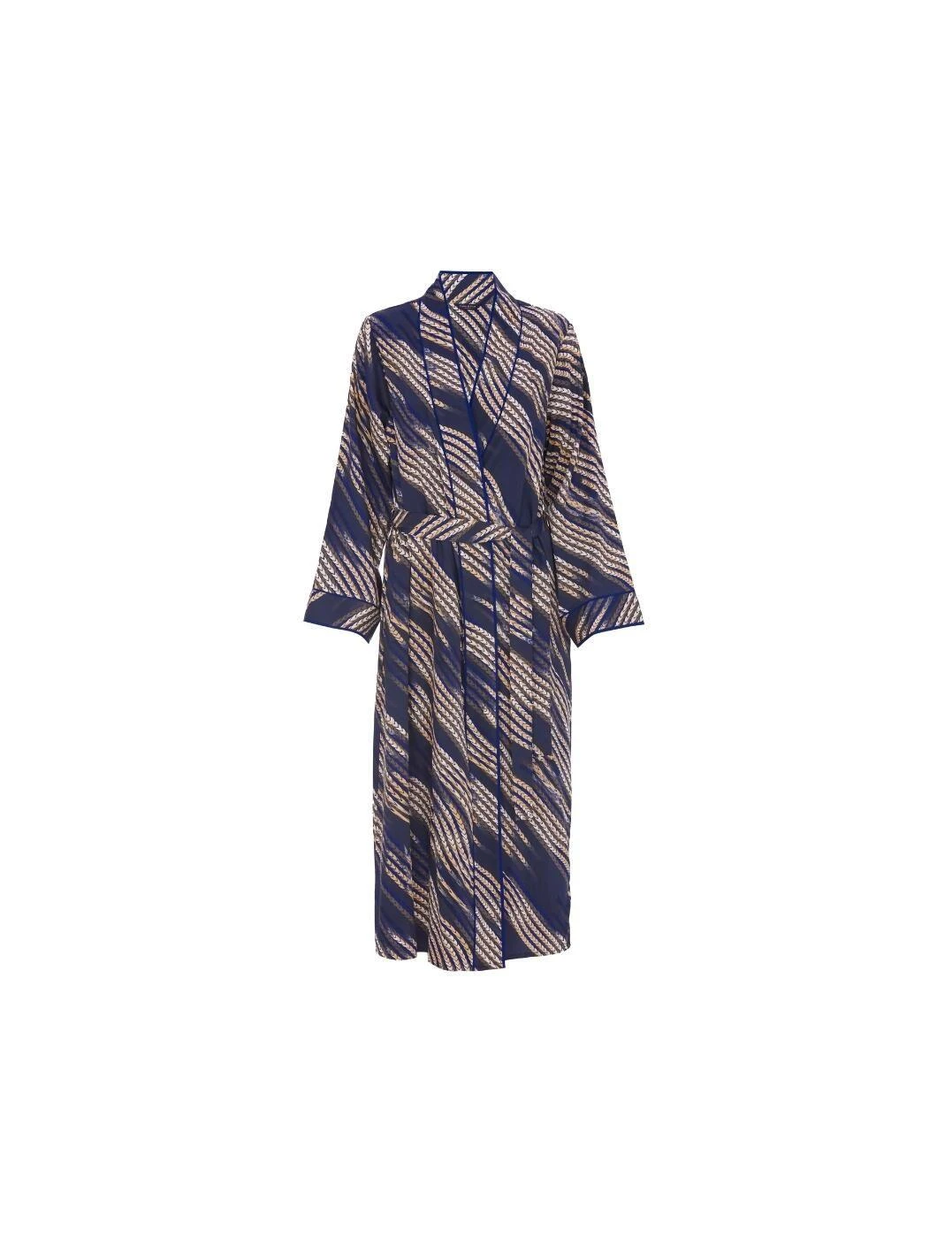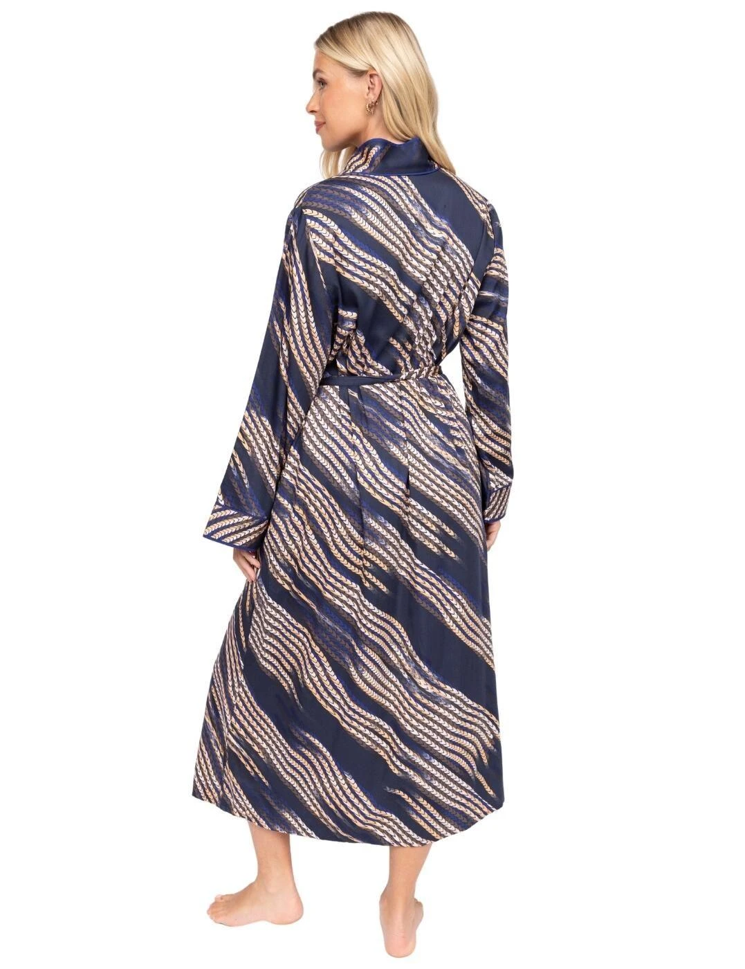 Choose the Southwark rope print long dressing gown by Cyberjammies Fable & Eve for a lavish loungewear experience you’ll be dreaming about. Designed with a sophisticated stripe rope pattern, this full-length dressing gown offers a kimono-style silhouette that feels just as indulgent as it looks. The adjustable wrap-over front ensures a perfect fit for peaceful evenings and busy mornings alike, while long sleeves with deep, cuffed hems and piped modal edges add timeless detail. Crafted from sustainably sourced and ethically made fabric, this dressing gown is a fantastic choice for both your eco-conscious and fashion-forward values, finished with two practical side pockets providing convenient lounging. For the ultimate dreamy ensemble, pair with coordinating Southwark nightwear for a look as serene as your sweetest dreams.