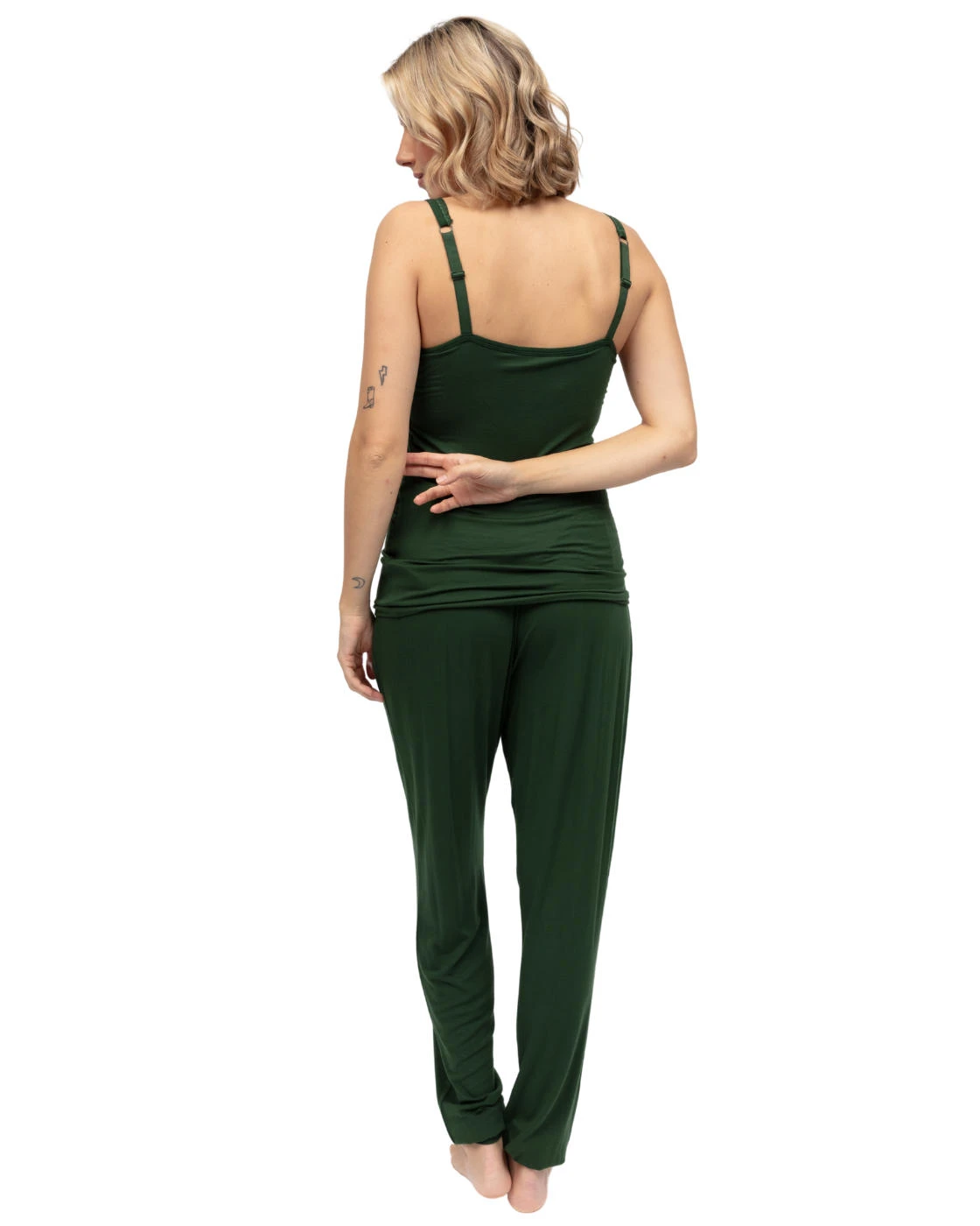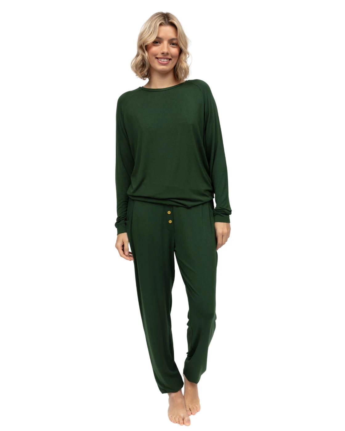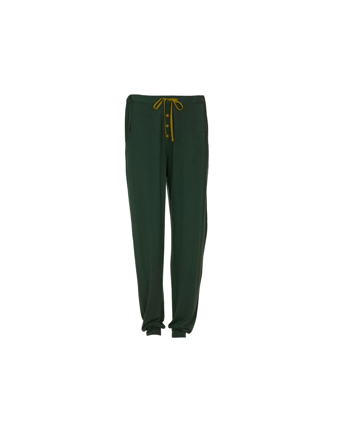 Slipping on in style for an effortless addition to your sleepwear collection with the Olive jersey pyjama bottoms from Cyberjammies. Constructed with exceptionally soft and sustainable fabric, these pants offer a striking plain opaque design, making them perfect to match with any of your current wardrobe. Sporting a cuffed bottom offering the feeling of joggers and the comfort of pyjamas, while the options of an adjustable drawstring is there, it also has an elasticated waistband for maximum personalised comfort. The addition of faux button detail gives an air of sophistication to the simple but timeless piece. Why not try coordinating this with the rest of the Olive collection to really show off your style?
