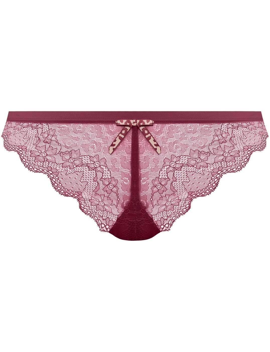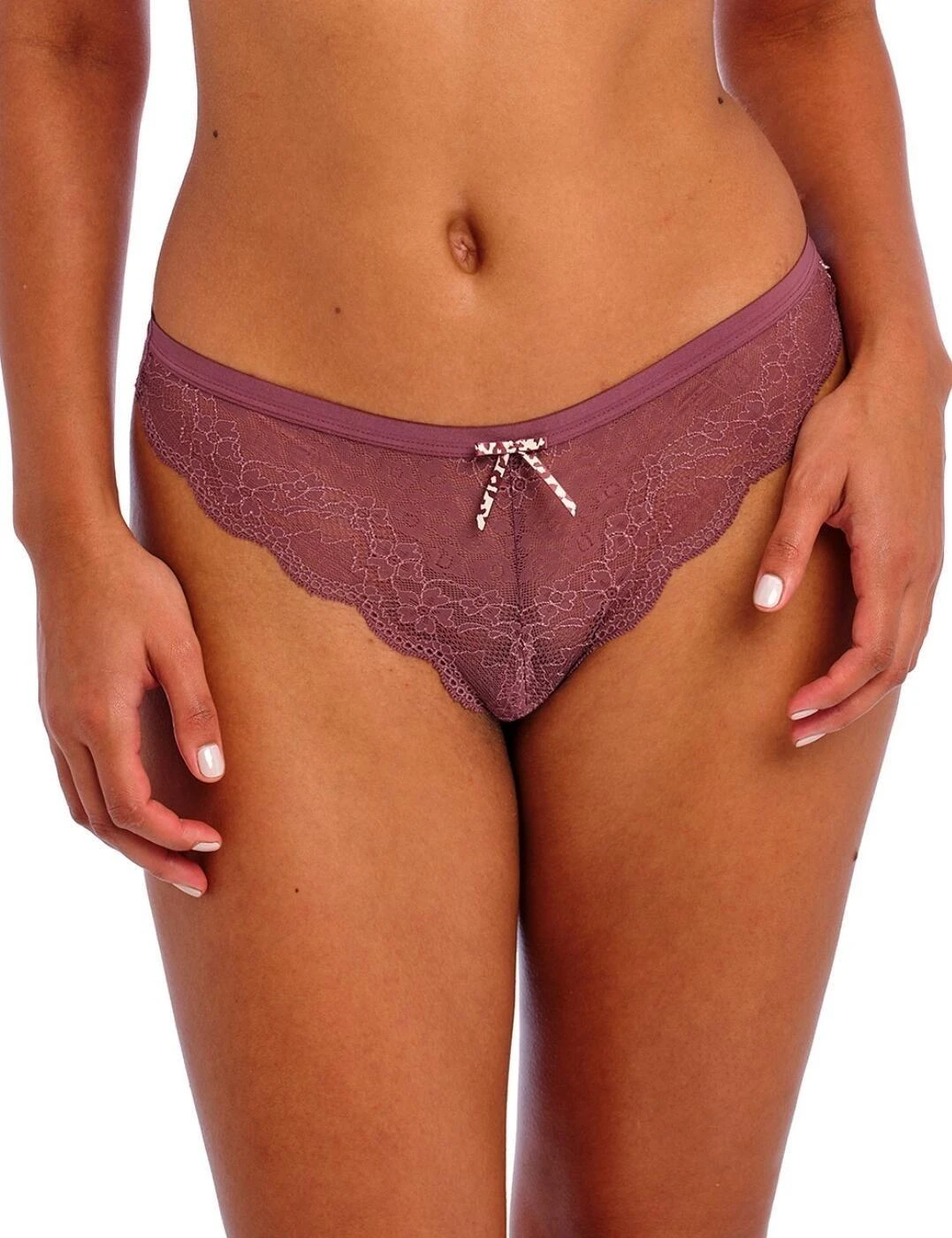 Feel flirty and fabulous in this alluring yet wonderfully comfortable everyday Brazilian brief from the Freya Fancies range by Freya! Delicate lace with scallop detailing creates a semi-sheer look that subtly reveals your skin in a tantalising way, get ready to look and feel irresistible! The soft materials of this piece feel fabulous against your skin too, this Brazilian brief really has it all. A low-rise waist and cheeky rear coverage celebrates your curves, and the look is finished with an eye-catching bow in the centre front that gives an additional feminine flourish! Pair with co-ordinating items from the Freya Fancies range to complete this show-stopping look!