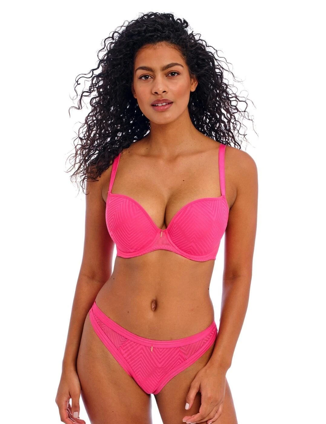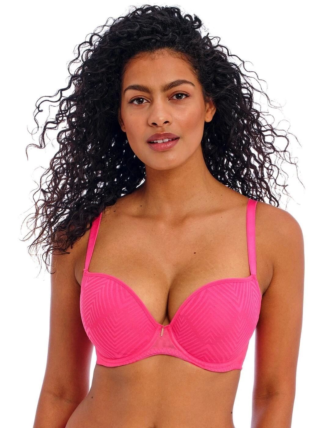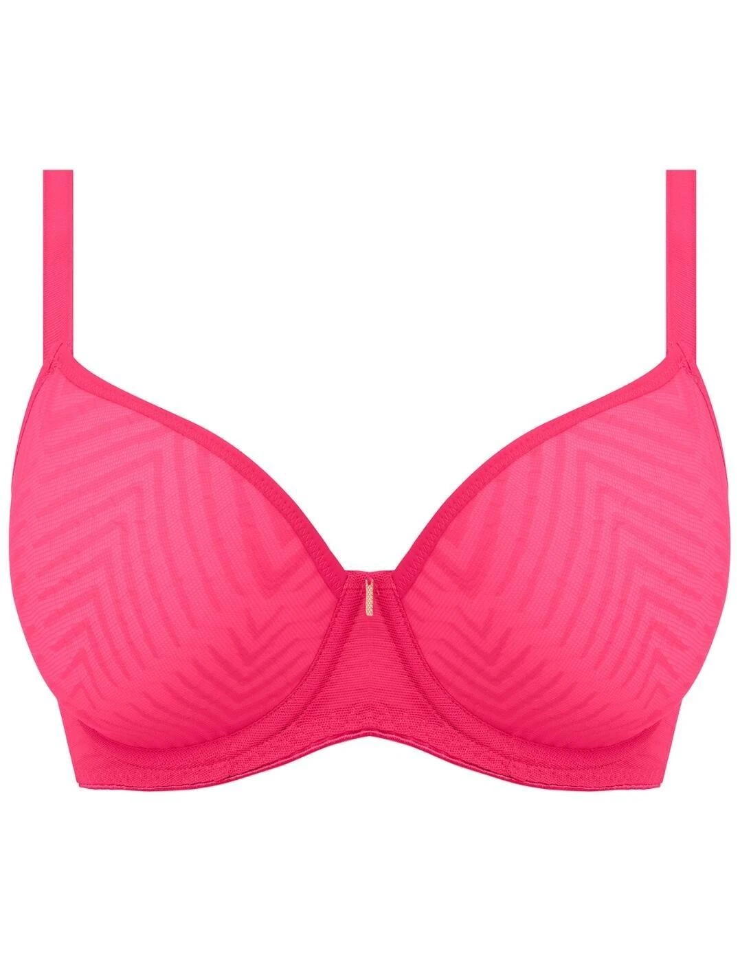 Fall deeply in love with this trustworthy underwired moulded plunge t-shirt bra from the romantic Tailored collection from Freya. This classic style bra oozes va va voom with the moulded cups that help create a smooth, rounded silhouette for a little boost. The neckline drops into a low centre front to give the desired flirty yet comfortable look. Fabulous geo-lace smothers the outer cups for a cool finish. The fully adjustable soft straps have you protected with the option to switch things up with a racerback style. Fully supported with the hook and eye fastening, the rose gold trim gives a touch of chic to the finish.