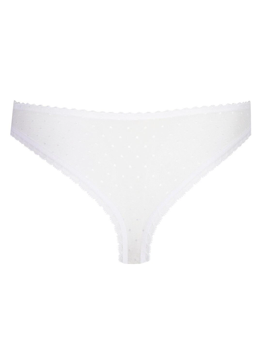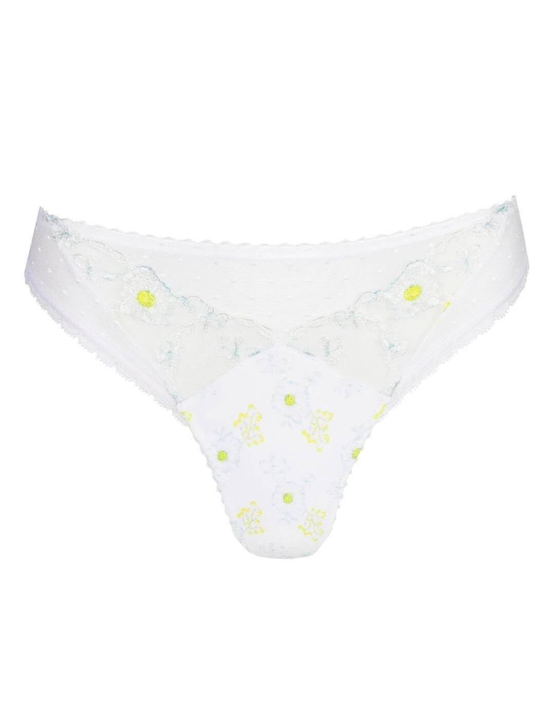 Step into luxurious femininity with this Marie Jo Chen thong. Showcasing a remarkable floral embroidered print and a pretty sheer polka dot pattern for the ultimate feminine look. It has a mid-rise waistband that sits beautifully on your hips and a high-leg cut for an irresistible silhouette. This thong offers minimal rear coverage so not only will it accentuate your curves but it will give you a seamless finish under any outfit, avoiding any unwanted visible lines. Pair with matching items to complete this stunning look.