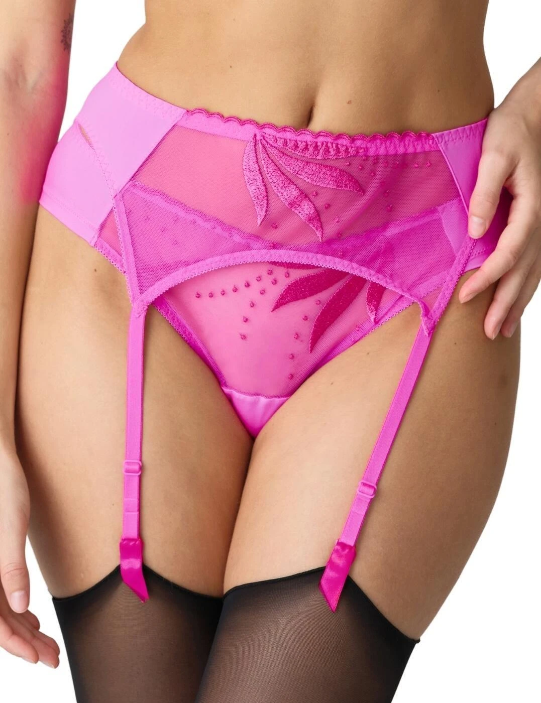 Explore your playful side with this gorgeous garter belt from Marie Jo’s Etoile collection. With exquisite embroidery taking centre stage on top of the sheer fabric creating a trendy aesthetic. This garter belt features adjustable suspender straps allowing you to customise the fit to your own preference and a hook and eye fastener to keep it in place. This garter belt is the perfect finishing touch to any woman’s lingerie, it can be worn at the hip or waist and can also be attached to stockings for an alternative look. Pair this item with matching lingerie pieces for a tantalizing look!