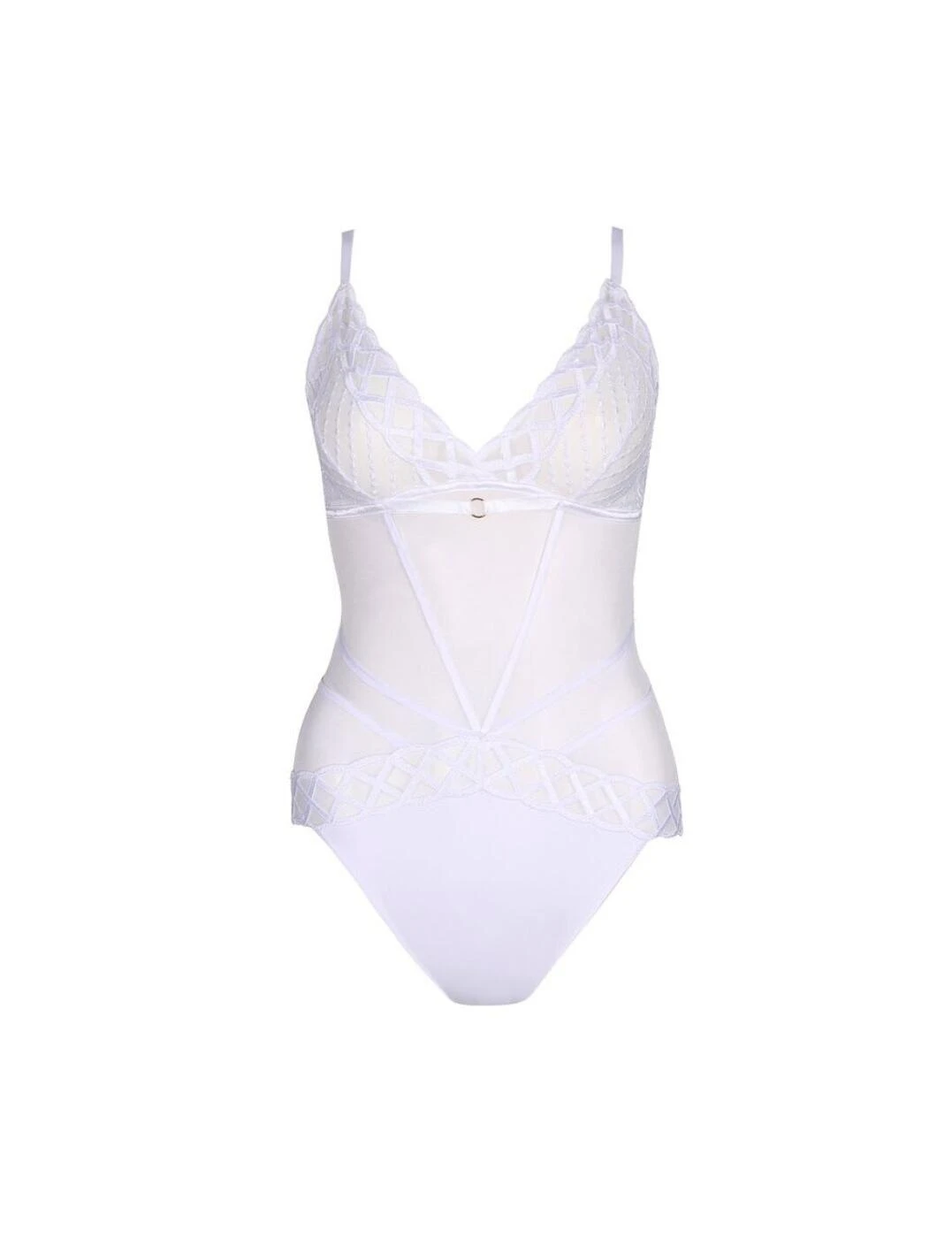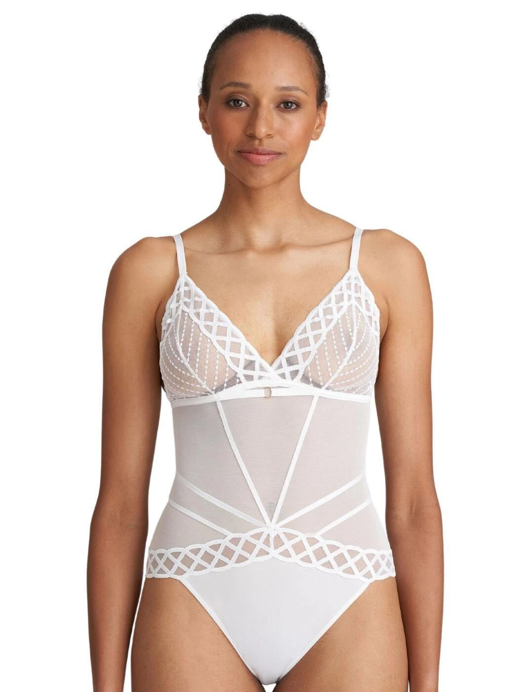For those exceptional moments when only the very best will do, why not indulge yourself with the exquisite Marie Jo Jhana bodysuit? Crafted from luxurious full lace, you won t be able to resist the semi-opaque coverage and flirty look of this beautiful piece. With its intricate lace detailing and scalloped paneling, it radiates sophistication and quality. This piece boasts non-padded, wireless cups for a natural look that embraces your curves. Plus, the bright contrast of the gold embellishments adds a stylish touch. Adjustable straps and a secure clip fastening ensure a perfect fit, as does the scoop back detail for ease of movement. Complete the look with one of the chic coordinates from the matching collection for an overall look that will turn heads.