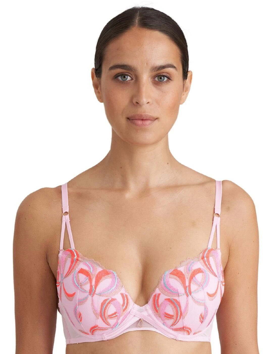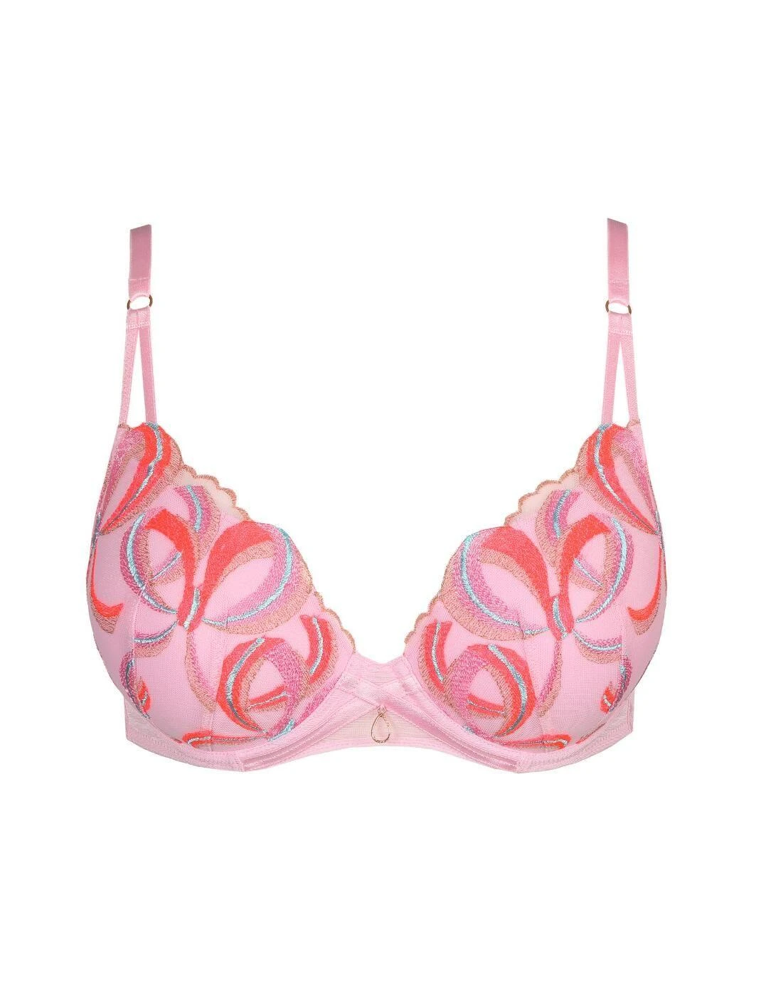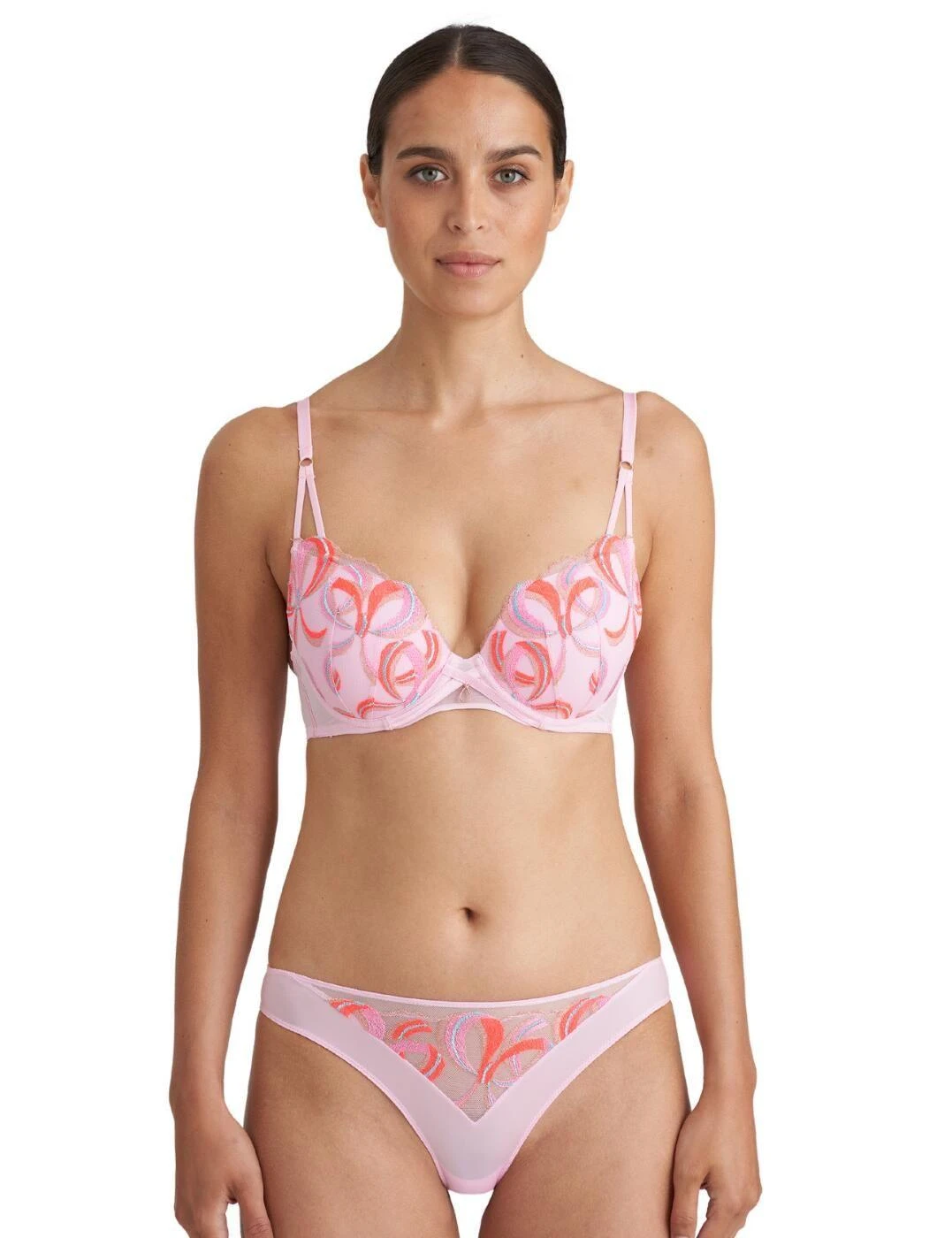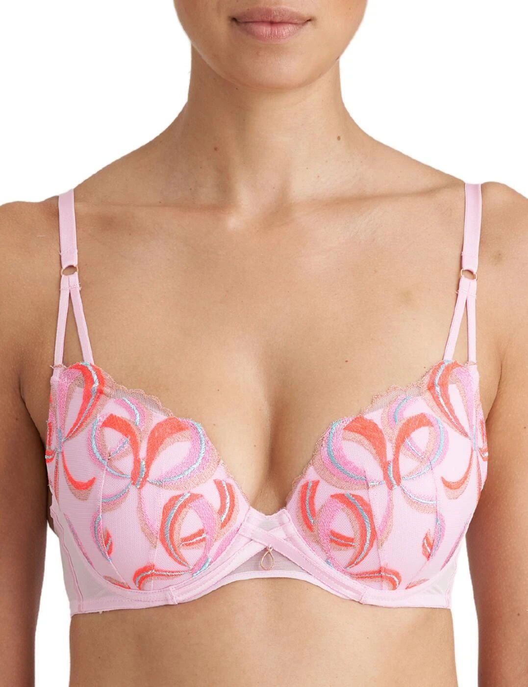 Marie Jo’s flirty plunge bra from the Vita range is playful and fun, with a vibrant embroidered design over the cups and a gold embellishment in the centre. The cups are underwired for support and padded to accentuate your bust, giving uplift and forward projection. Adjustable straps ensure that you can get the perfect fit and the rear hook and eye fastening will stay snug and secure. Pair this charming bra with briefs from the Vita collection for a flawlessly feminine combination.