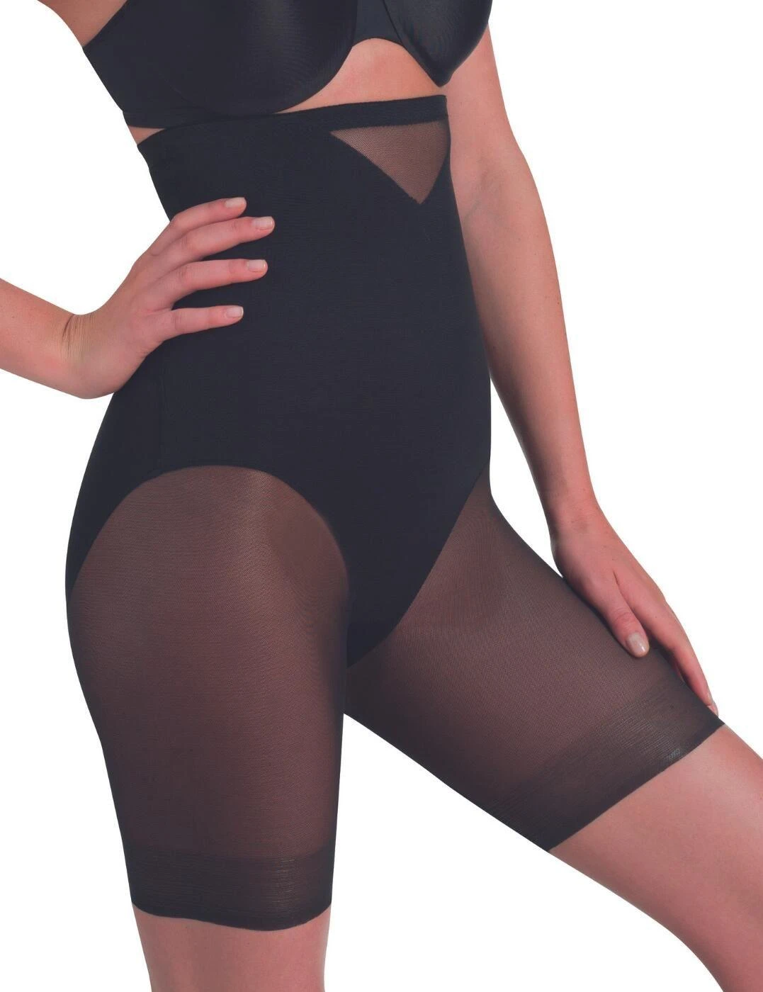 The Sexy Sheer high waist thigh slimmer provides superior smoothing without discomfort. The longer leg style allows this brief to give an all-over smoother appearance for a more natural look under clothing. Layered tulle provides firmer control that contours your body easily. Comfortable and breathable cotton keeps you feeling fresh all day. Silicone strips prevent rolling and keep the brief in place all day.