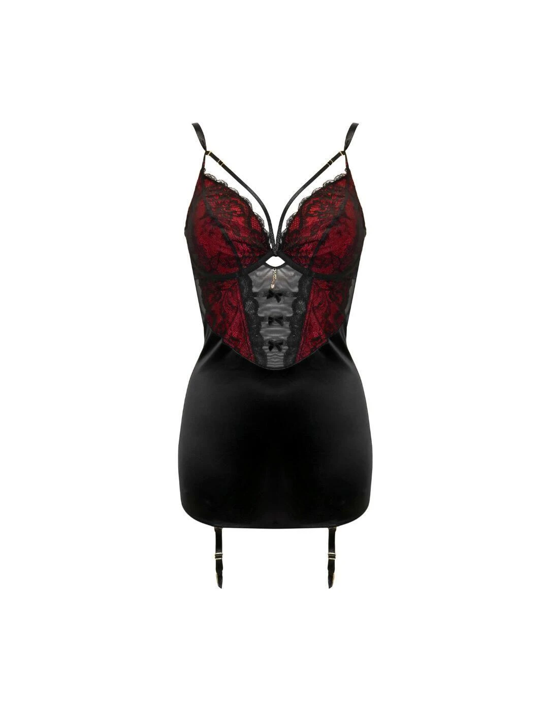 Step into the world of elegance and excitement with the Pour Moi Desire cami dress. The triangle plunging neckline and mini length of this dress will accentuate your curves in all the right places. The underwired and non-padded cups provide the perfect amount of support, while the sexy floral lace top adds a touch of femininity. Adorned with bows down the centre front and a lock and key gold charm, this dress is a statement piece that will turn heads. The keyhole at the centre front adds an extra element of seduction, while the satin-like skirt adds a touch of glamour. Adjustable shoulder and suspender straps allow for a customized fit, ensuring that you feel comfortable and confident all night long. And for the ultimate coordinated look, don’t forget to check out the matching coordinates available.