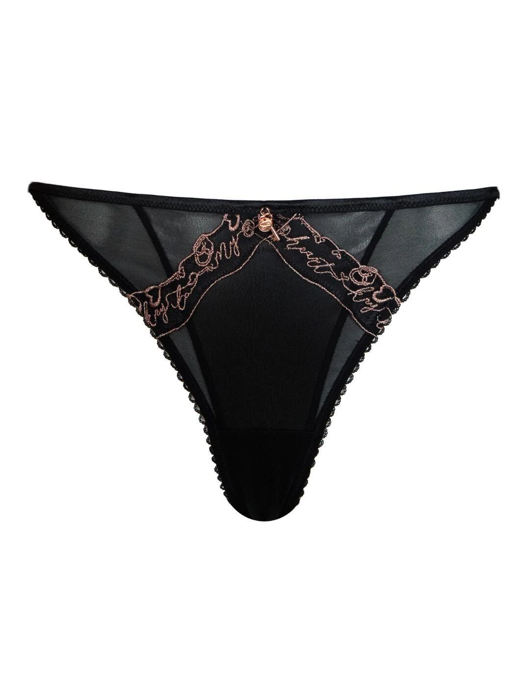 This gorgeous bold bare faced brief from the Key To My Heart Range by Scantily by Curvy Kate is stylish and sexy, designed to be seen and admired! Delicate metallic embroidered love notes, semi sheer panels, and a metallic key charm on the centre front combine to create an eye catching and mesmerising look. Designed for plus sizes, the low-rise waist and high cut leg holes will enhance and flatter your gorgeous curves. Heart shape cutout on the rear finishes off this very seductive look perfectly. Match with the coordinating lingerie from the Key To My Heart range to elevate this sultry look further.