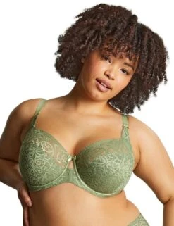 Elevate your everyday lingerie with the Estel full cup bra by Sculptresse by Panache. Boasting delicate stretch lace top cups and opaque, lined lower cups, this romantic bra offers an accommodating fit that feels just as good as it looks. The star of the show is the enchanting shine lace design, promising an unapologetically feminine feel that exudes confidence and charm. It’s crafted from soft yet powerful fabric with non-padded cups to deliver all-day comfort, while the underwired structure provides unmatched support. Plus, smoothing wings ensure a flawless silhouette under any outfit and an elegant bow and cut-out centre add sultry sophistication to your look. Finished with adjustable straps, a hook-and-eye closure, and additional elastic in GG+ sizes for inclusive support, this bra truly adapts to your needs. Wear with matching Estel lingerie to complete this indulgent everyday look.