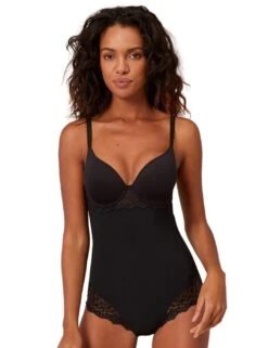 The Caresse control body by Simon Perele is a wardrobe must have. Ultra soft cotton lined cups will keep you fresh and feeling comfortable all day. Underwired without padding gives you a more natural lift. A deep plunging neckline makes this body perfect to wear under your favourite low cut tops or dresses. With seams lay flat against the body on the rear, providing you with more confidence and options of what to wear this body with! No hook and eye fastening at the back means a seamless look under clothes and a more comfortable fit for you. Fastens with snaps at the crotch, with several fasteners you have more control over the fit. Adorned with lace panel around the band that extends to the sides offering a beautiful contrast to this opaque body. The high leg fit offers more movement and is finished off with a beautiful scalloped lace trim.