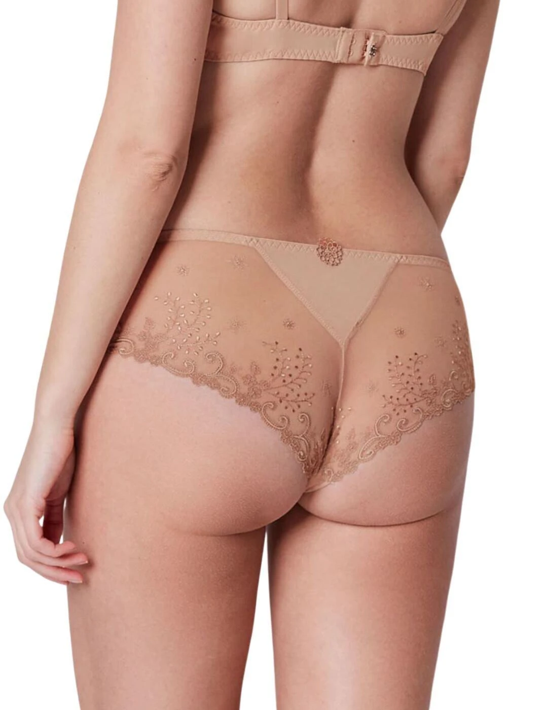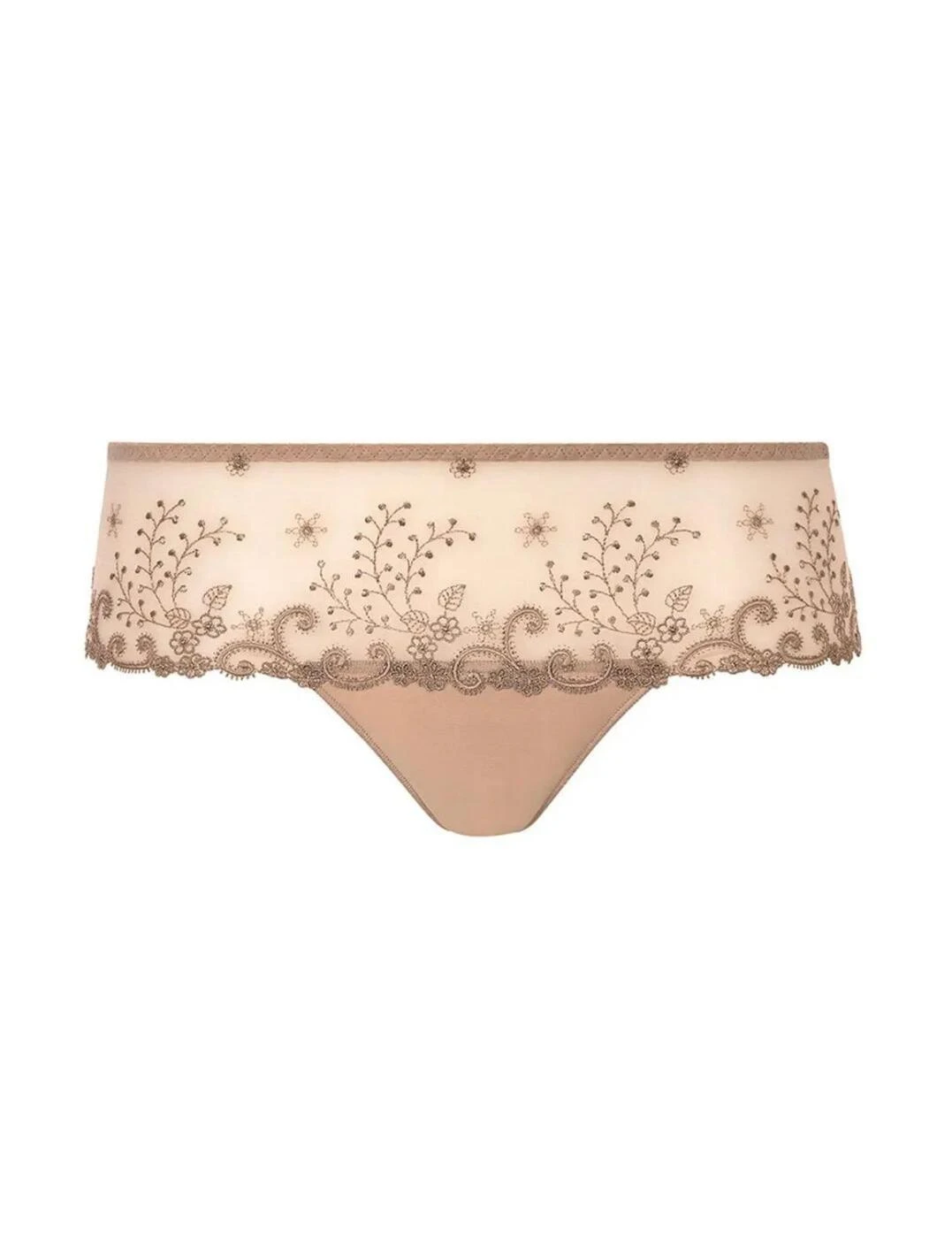 Feel seductive in these Delice shorty briefs by Simone Perele. A sheer mesh bandeau style front with a full rear provides a flirty and modern twist on a classic brief. Delicate floral embroidery breaks up the sheer mesh and offers a feminine look. The full rear is almost completely sheer adorned with the same delicate embroidery featured on the front. The full rear provides a modest fit while the sheer fabric gives a sensual look to them. Opaque panels are featured on the crotch and the top back of the brief. A delicate guipure lace motif is featured on the rear of the briefs.