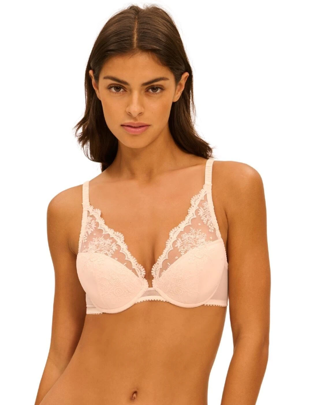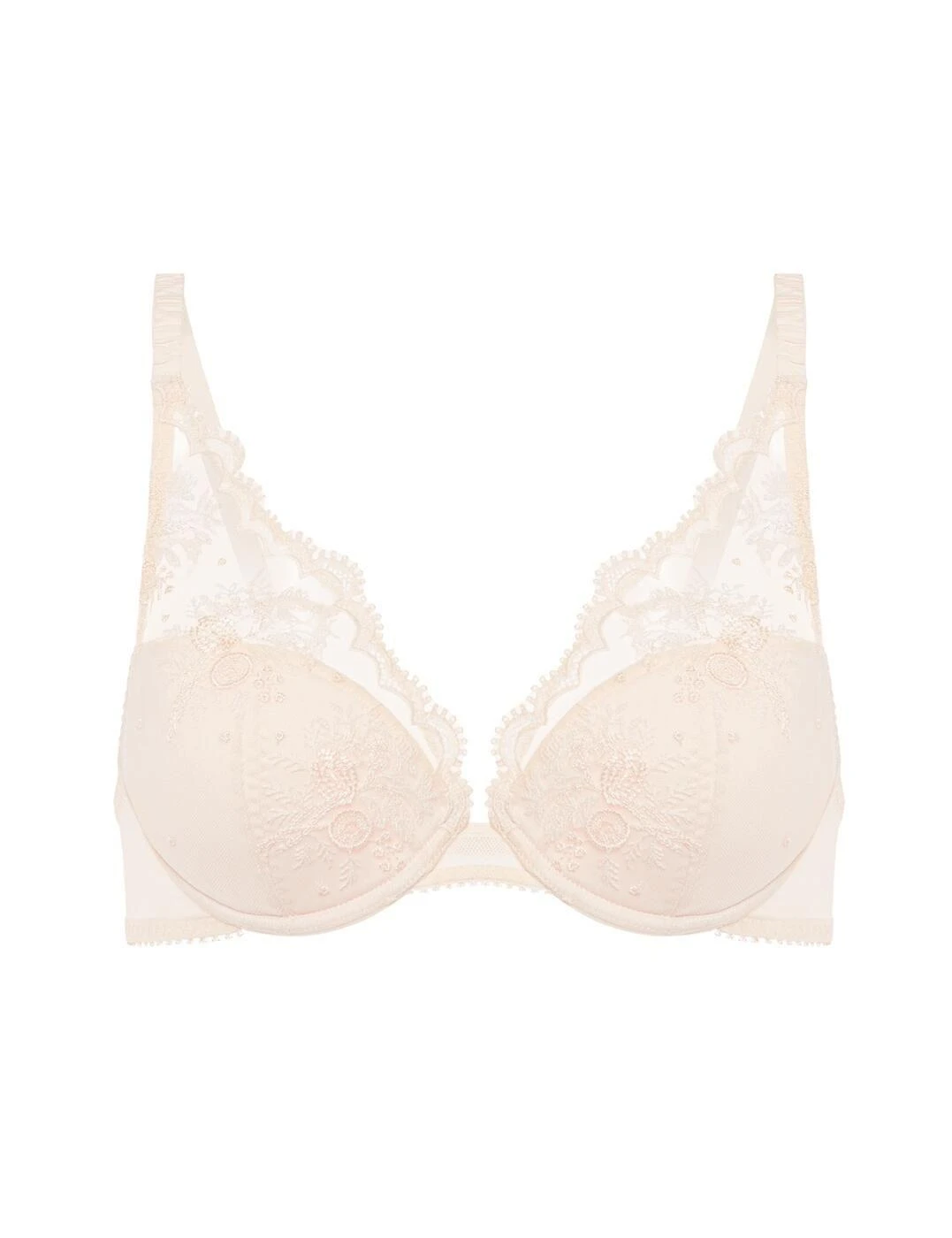 Add enchanting allure to your lingerie wardrobe with the Intrigue push-up bra by Simone Perele. Designed to flawlessly accentuate and enhance your natural bust, this luxurious bra features soft, padded cups with a refind triangle shape and underwired support for uncompromising comfort. The high apex design creates an irresistible plunge neckline, celebrating your curves with an exceptionally feminine silhouette, while delicate scalloped edges and a floral embroidered overlay add touches of timeless elegance. Sustainably crafted from recycled embroidery, this bra feels as good as it looks, with adjustable straps and a hook-and-eye closure ensuring a fit perfectly tailored to you. What’s more, additional tulle lining in larger sizes ensures optimal support for everyone. Wear with matching lingerie from the Intrigue collection for a truly enchanting ensemble.