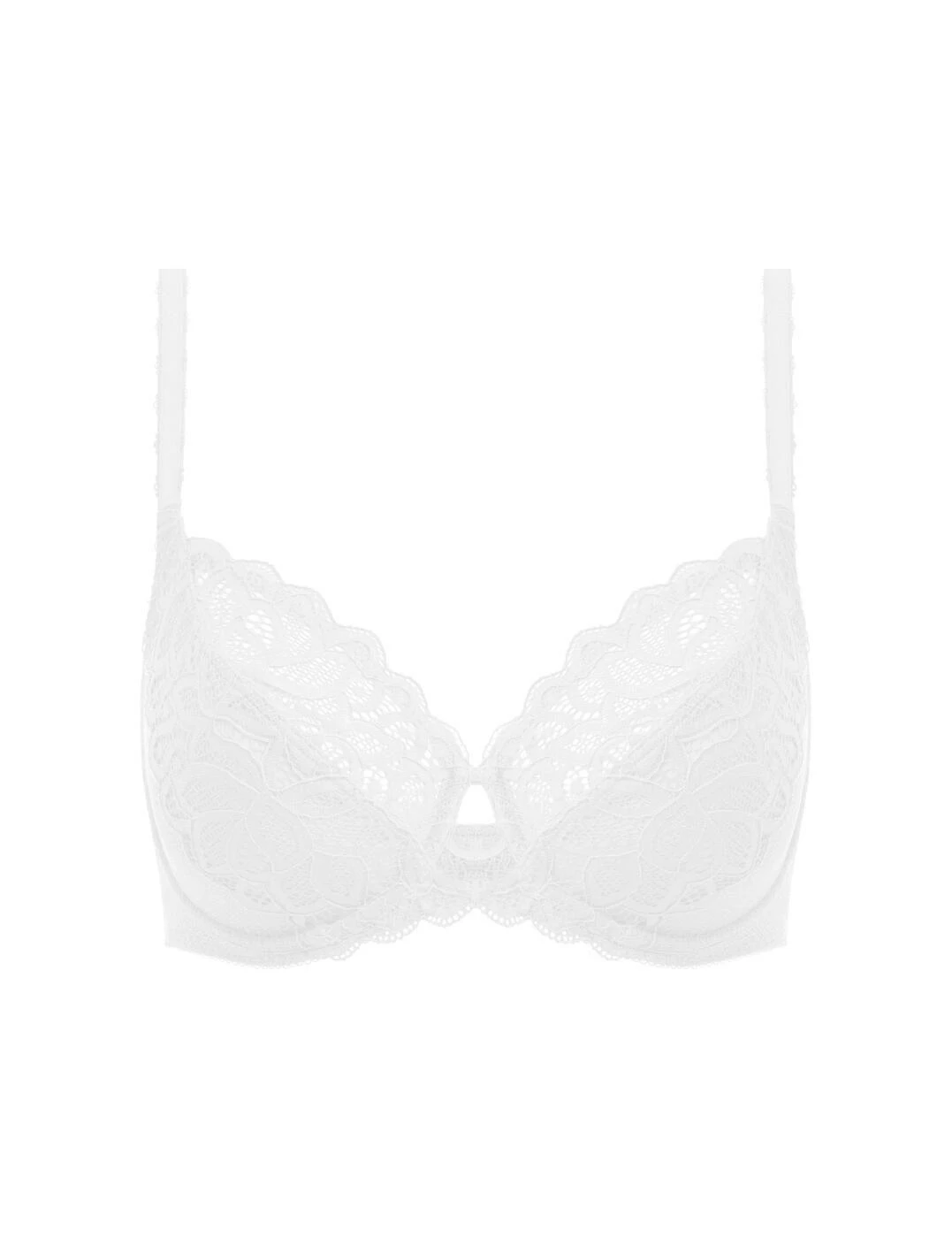 Wacoal’s Raffine plunge bra is effortlessly chic, with a semi-sheer upper cup adorned with an elegant lace design adding a playful, feminine touch. The cups are non-padded for a smooth, natural shape and feature an underwire for support. The front keyhole design and the plunging neckline add a flirty touch, with scalloped edges adding the perfect playful touch. Adjustable straps ensure you can get the right fit for you and the rear hook and eye fastening will stay secure all day long.